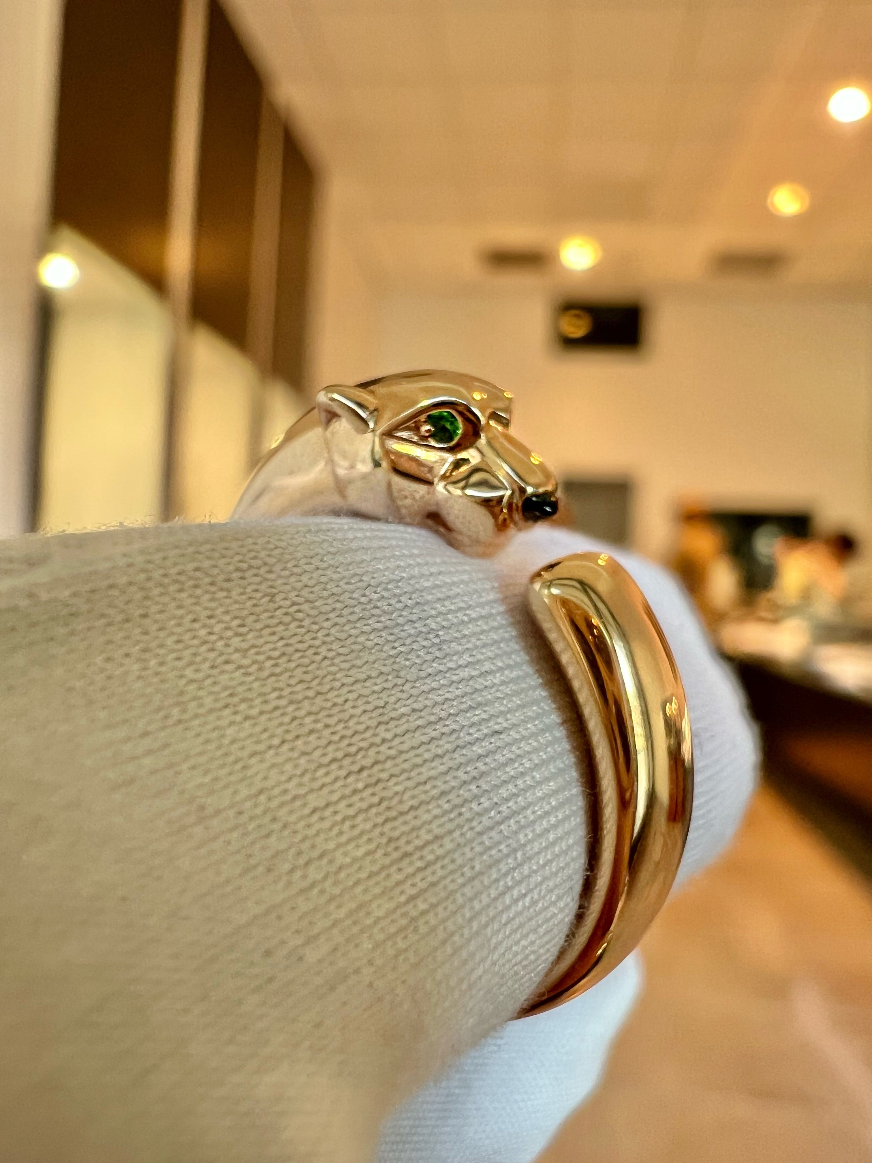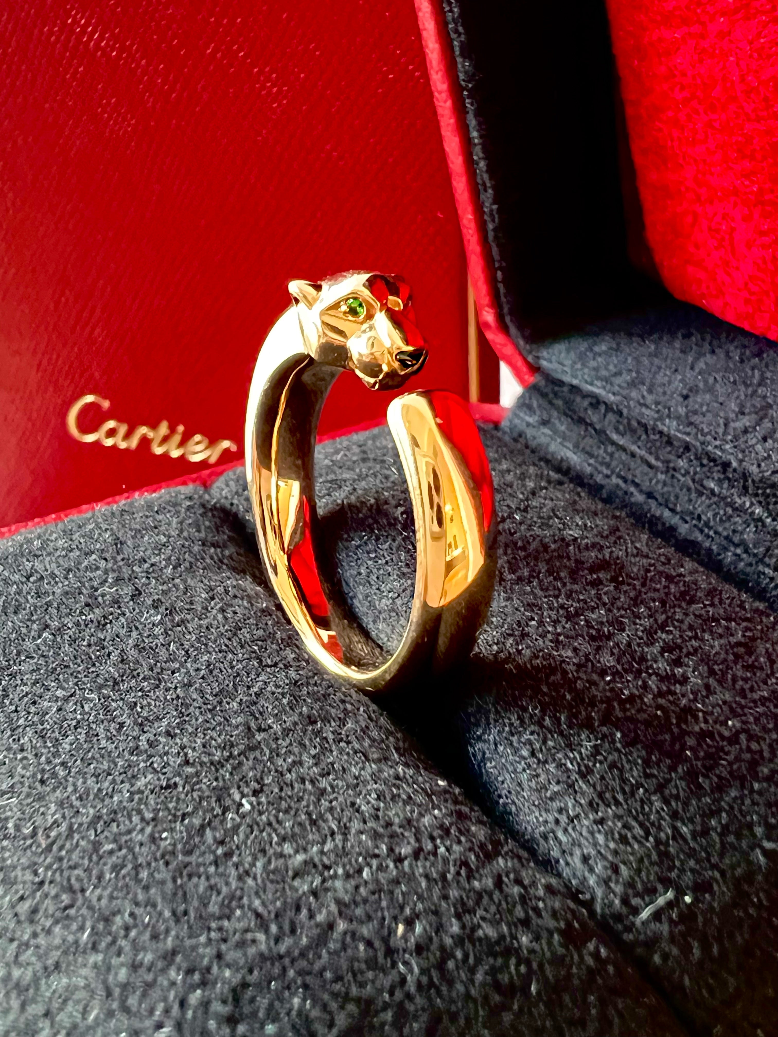 A timeless icon of Cartier's artistry, the Panthère de Cartier ring embodies strength, elegance, and allure. Crafted in 18k Yellow Gold, the sculpted Panther head features mesmerizing Tsavorite Garnet Eyes and a sleek Onyx Nose, bringing the feline to life with captivating intensity!